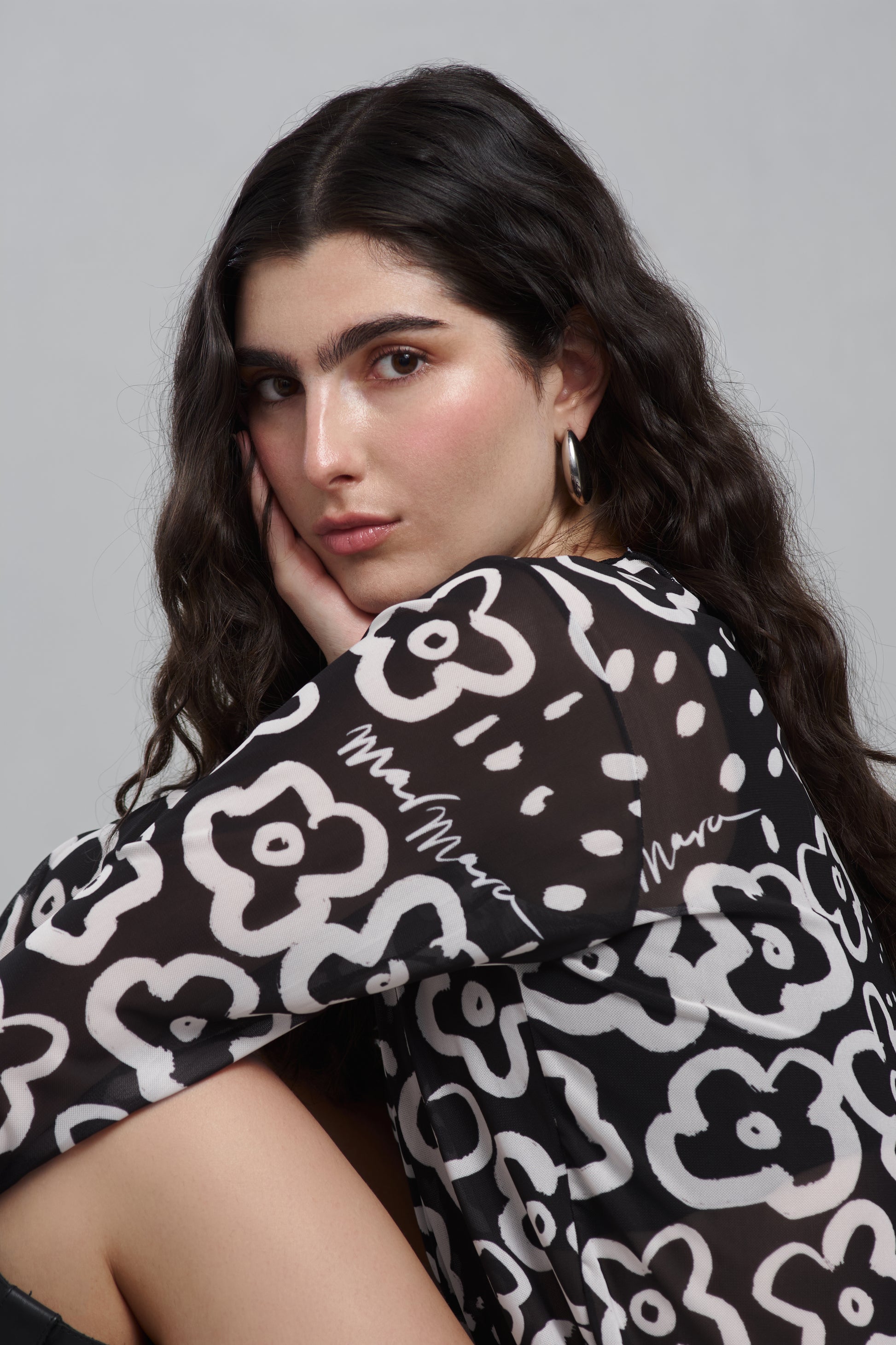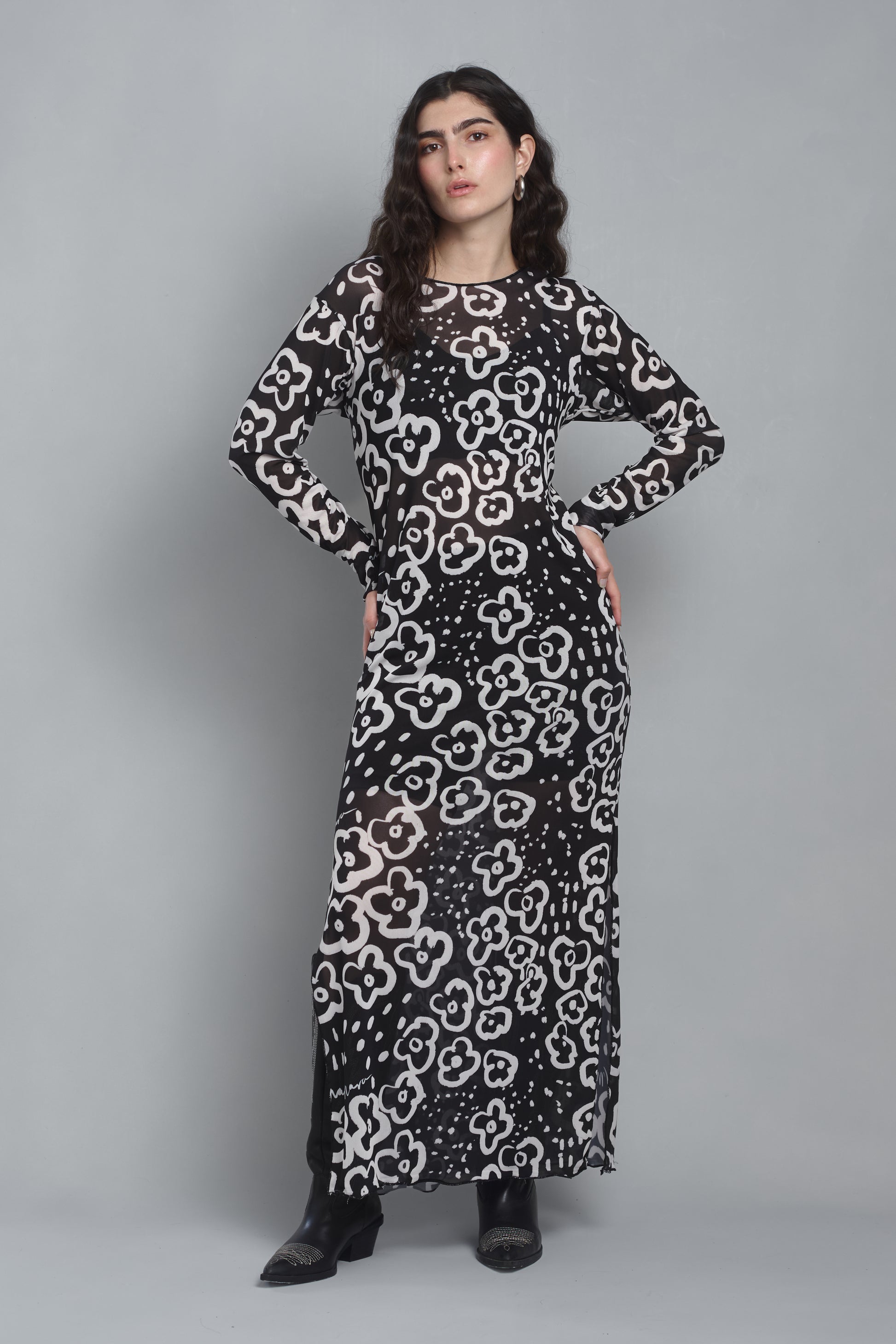 Vestido en malla semi transparente completamente estampado con nuestro print flowers color negro. Corte recto . Con aberturas laterales. Manga larga y cuello redondo.